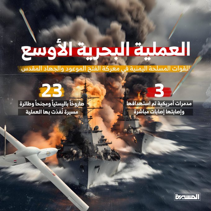 بالإضافة إلى إطلاق 23 صاروخًا بالستيًّا ومجنحاً وطائرة مسيَّرة على ثلاث مدمّـرات أمريكية كانت تعبر البحر الأحمر لإسناد العدوّ الصهيوني، وأكّـدت القوات المسلحة أن جميع الضربات أصابت أهدافها بدقة.