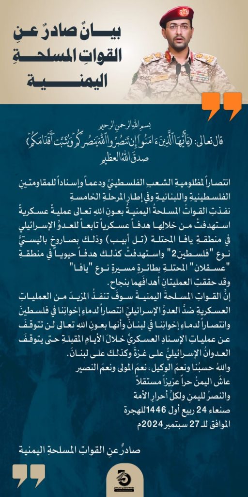 العمليات التي أعلنتها القوات المسلحة اليمنية في بيانَينِ منفصلَينِ، شملت إطلاق صاروخ (فلسطين2) الفرط صوتي على هدف عسكري للعدو في يافا المحتلّة “تل أبيب”، وإطلاق طائرة (يافا) المسيَّرة بعيدة المدى على هدف حيوي في عسقلان