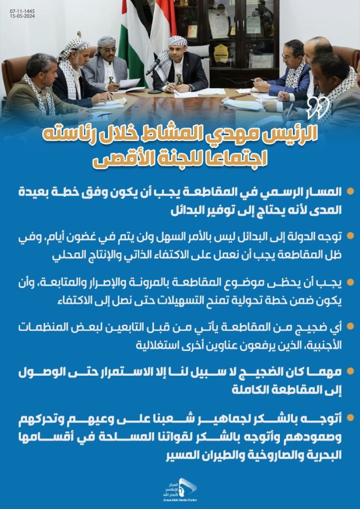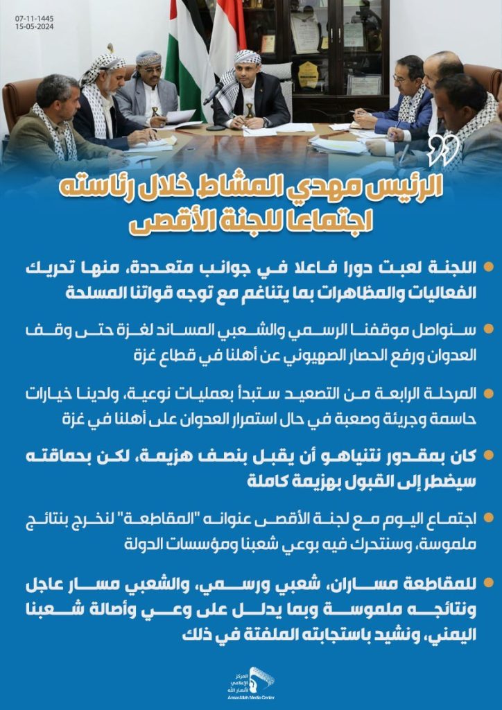 وخلال ترأسه امس الأربعاء، 15 أيار/مايو 2024 اجتماعًا للجنة العليا للحملة الوطنية لنصرة الأقصى، لفت الرئيس المشاط الى أهمية الدور الذي تقوم به اللجنة في مختلف الجوانب ومنها تحريك الفعاليات والمظاهرات، والذي يأتي متناغمًا مع ما تقوم به القوات المسلحة سواء القوات البحرية أو القوّة الصاروخية والطيران المسير من عمليات لمساندة أبناء الشعب الفلسطيني في غزّة.