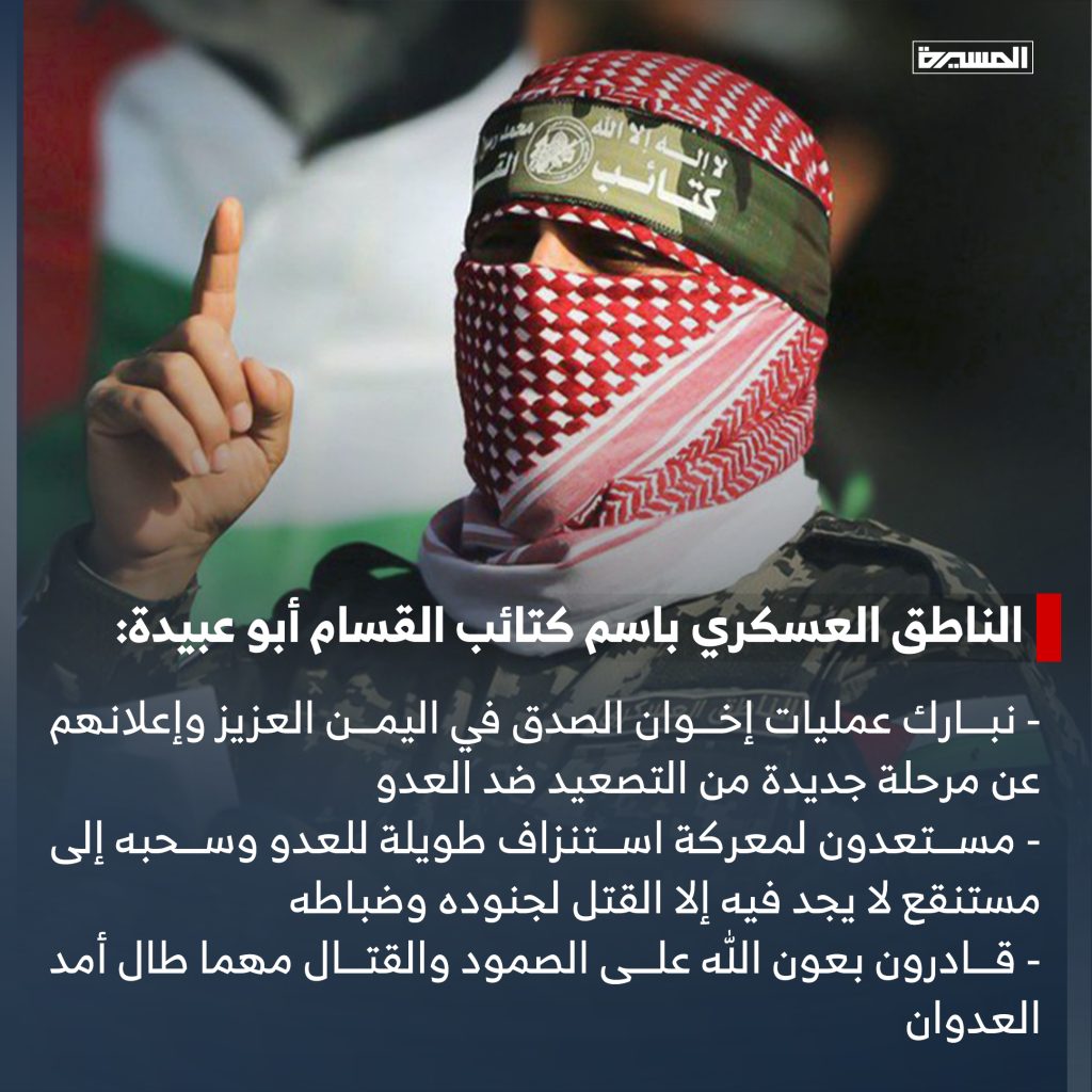 بارك الناطق العسكري باسم كتائب الشهيد عزالدين القسام الجناح العسكري لحركة المقاومة الإسلامية حماس “أبو عبيدة”، امس الجمعة، إعلان اليمن بدء تنفيذ المرحلة الرابعة من التصعيد لمساندة أهالي غزة.