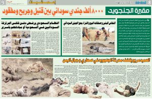 في حرب خاسرة زج النظام السوداني بالعشرات من أبناء السودان في أتون حرب ليس لهم فيها ناقة ولا جمل سوى الحصول على فتات السحت الذي منَّ به النظام السعودي المجرم لمرتزقة النظام السوداني ليسوق لهم الأخير آلاف من المجندين السودانيين إلى محارق اليمن دفاعاً عن آل سعود وفي خدمة عيال زايد وفي ذات الوقت لم يكتفي النظام السعودي بإدماج الجيش السوداني ضمن جنوده في الحد الجنوبي بل دفع بهم إلى محارق الموت في صحراء ميدي ووديان جيزان ليكشف الجيش واللجان الشعبية بعد خمس سنوات من العدوان الإجرامي عن خسائر قاسية تعرض لها المرتزقة السودانيون أغلبها في صحراء ميدي حيث كشف العميد سريع عن تلاشى أكثر من 8000 الف جندي سوداني بين قتيل وجريح ومفقود.