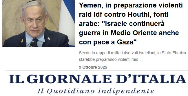 قالت صحيفة ” Il Giornale d’Italia” الإيطالية، أن إسرائيل تُعد لعملية عسكرية واسعة النطاق ضد اليمن، وذلك بعد ساعات قليلة من توقيع اتفاق “سلام” أو هدنة محتملة مع حماس بشأن غزة.