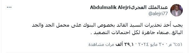وأكد العجري في حسابه على منصة “إكس ” : ان صنعاء جاهزة لكل احتمالات التصعيد .