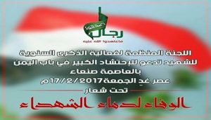 دعت اللجنة المنظمة للذكرى السنوية للشهيد ، جماهير الشعب اليمني إلى الاحتشاد الكبير عصر غد الجمعة في باب اليمن بالعاصمة صنء لإحياء الذكرى السنوية للشهيد تحت شعار ” وفاء لدماء الشهداء “.