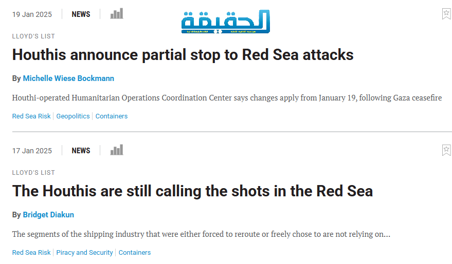 الحقيقة رصدت عناوين صحيفة “لويدز ليست” البريطانية المتخصصة في شؤون الملاحة البحرية من تأريخ الــ14 إلى الــ22 من يناير 2025م