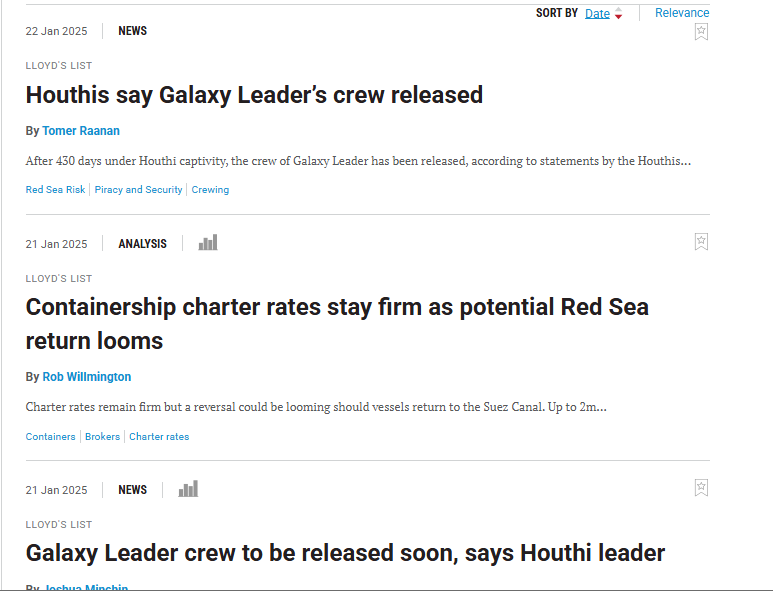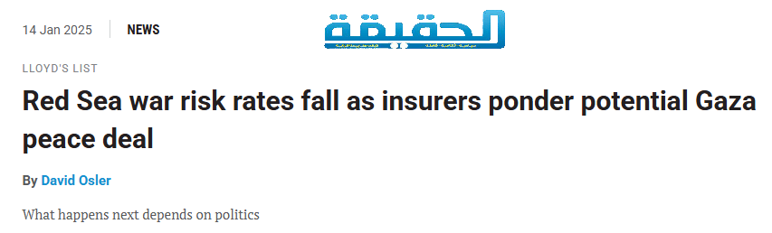 16 يناير 2025م:انخفاض معدلات مخاطر الحرب في البحر الأحمر مع تفكير شركات التأمين في اتفاق سلام محتمل مع غزة