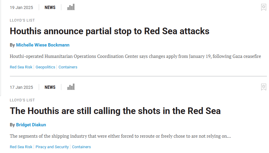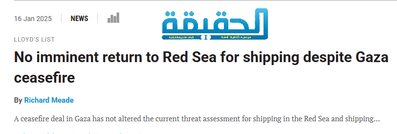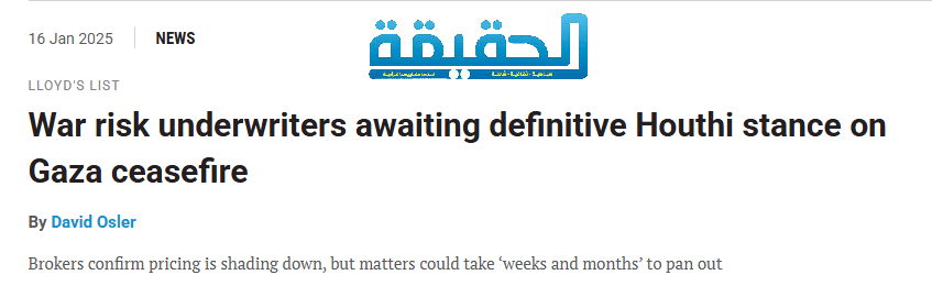 16 يناير 2025م:شركات التأمين على مخاطر الحرب تنتظر موقف الحوثيين النهائي بشأن وقف إطلاق النار في غزة