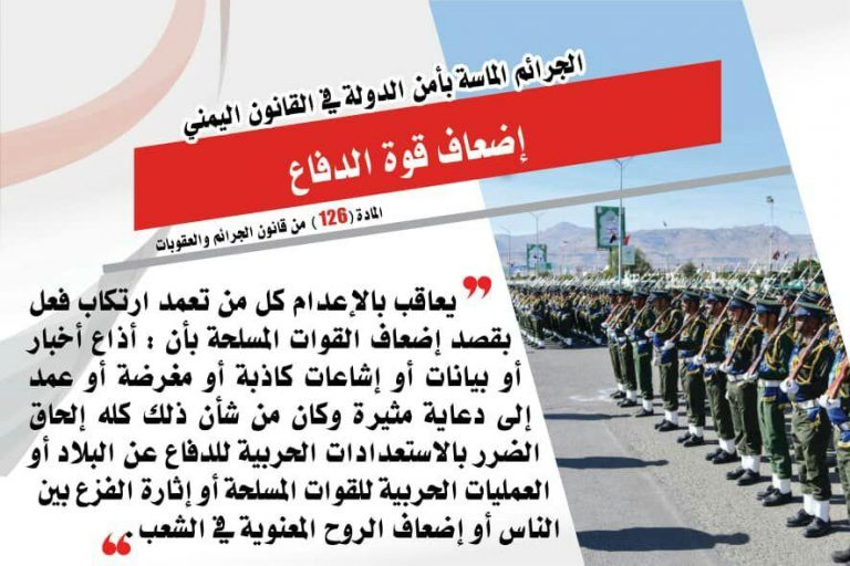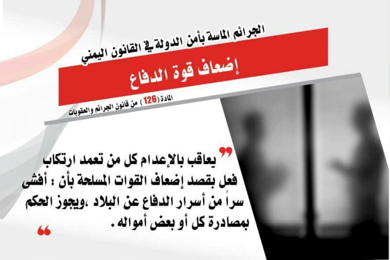 يعد إضعاف قوة الدفاع للقوات المسلحة اليمنية من أشد الجرائم التي يرتكبها الخائن للوطن، تحت أي مسمى كان، فالتعمد جريمة وارتكاب الجريمة والإصرار عليها أشد جرما وبشاعة، فقد نصت المادة (126 ) من قانون الجرائم والعقوبات “