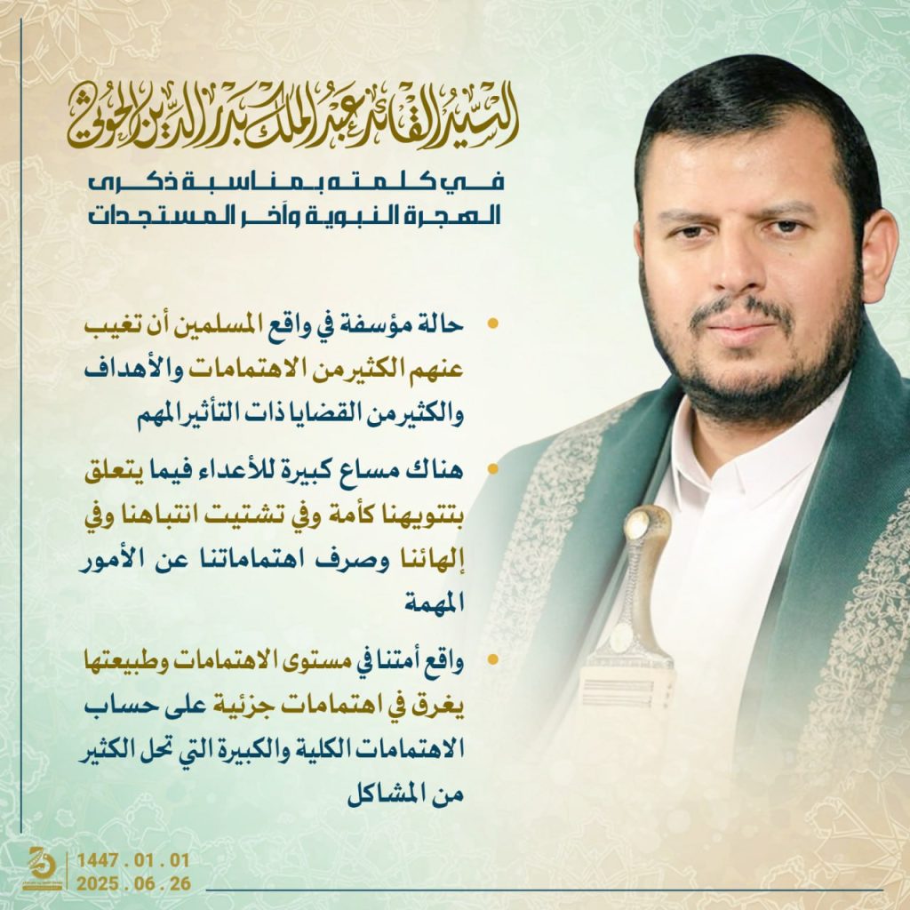 خاتماً في مطلع عام هجري جديد. السيد القائد يعرض رؤية متكاملة تربط الزمان بالحدث والوعي بالمسؤولية ويضع معادلة جديدة في المنطقة: أن يكون المسلم مدركاً لقيمة وقته واعياً لهدف وجوده وثابتاً على درب المواجهة. ففي زمن تتحول فيه المناسبات إلى روتين يجب أن يتحول العام الهجري الجديد إلى منصة للصحوة ومحرّكاً للتغيير.