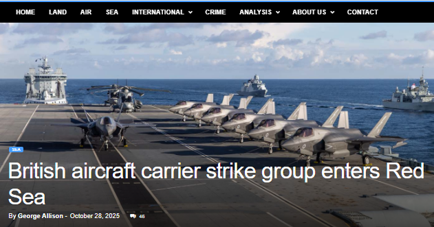 قال ع مجلة الدفاع البريطانية أن حاملة الطائرات البحرية الملكية إتش إم إس برينس أوف ويلز عبرت شمالا عبر مضيق باب المندب ودخلت البحر الأحمر في 27 أكتوبر، وفقا لصور الأقمار الصناعية وبيانات تتبع السفن.