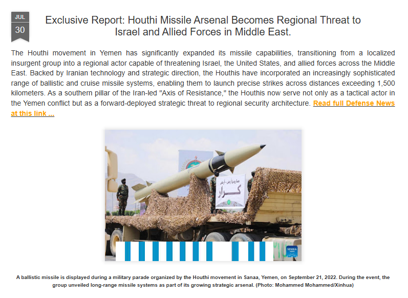 وفي تقرير تحليلي نشرته في الــ30 من يوليو أشارت المجلة الإلكترونية الرائدة في مجال الدفاع والأمن والتي تغطي أحدث الابتكارات والمنتجات والأخبار من القوات البرية والبحرية والجوية في جميع أنحاء العالم. إلى أن القوات اليمنية أصبحت قادرة على إطلاق صواريخ باليستية وكروز تصل إلى مدى يتجاوز 1500 كيلومتر، ما يضع منشآت إسرائيلية وأميركية حساسة في مرمى النيران اليمنية.
