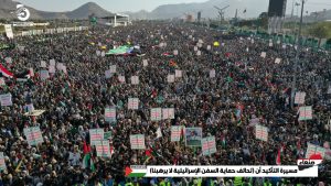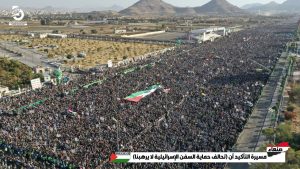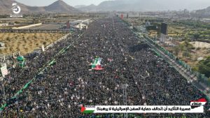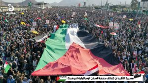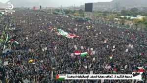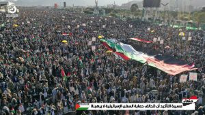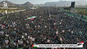 وحذرت الحشود كل الدول من التورط في الانخراط في هذا التحالف الذي يهدف إلى حماية الكيان الصهيوني الغاصب، ويمثل خطرا وتهديدا على الملاحة الدولية في البحرين الأحمر والعربي.