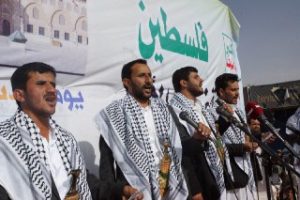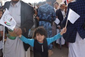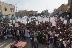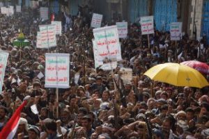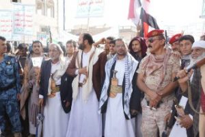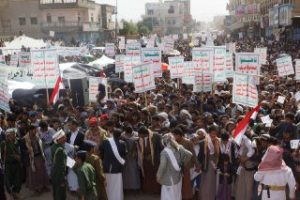 و في الساحة الكبرى للمدينة رفع المتظاهرين أعلام الجمهوية اليمنية والأعلام الفلسطينية ولافتات الحرية المناهضة للسياسة الأمريكية في المنطقة.