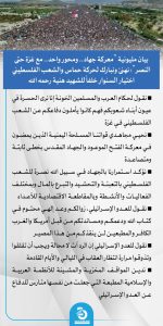 – نؤكد استمرارنا بالجهاد في سبيل الله نصرة للشعب الفلسطيني بالتعبئة والتحشيد والتبرع بالمال وبمختلف الفعاليات والأنشطة وبالمقاطعة الاقتصادية للأعداء