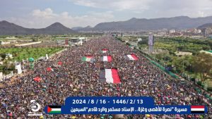 وقد شهدت العاصمة صنعاء اليوم، خروجاً مليونياً في مسيرة “للأقصى وغزة.. الإسناد مستمر والرد قادم” تأكيداً على الاستمرار في نصرة الشعب الفلسطيني المظلوم.