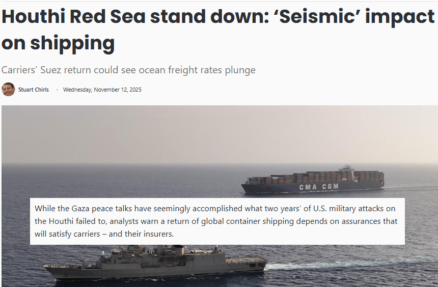 أكّـد موقع .freightwaves المتخصص في شؤون النقل والشحن العالمي، أن اتّفاق وقف إطلاق النار في غزة نجح في تحقيق ما عجزت عنه الهجمات العسكرية الأمريكية ضد اليمن، بعدما أعلن اليمن وقفًا مؤقتًا لهجماته على السفن الإسرائيلية والشركات المتعاونة معها في البحر الأحمر، وهو ما أثار آمالًا بعودة حركة الشحن عبر قناة السويس لأول مرة منذ عام 2023.