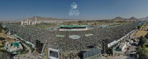 وتوسطن الحشود الملايينية مساحة بيضاء كتب فيها اسم النبي محمد صلى الله عليه وآله وسلم باللون الاخضر والتف الجميع حولها مرددين بأعلى صوتهم “لبيك يارسول الله.”