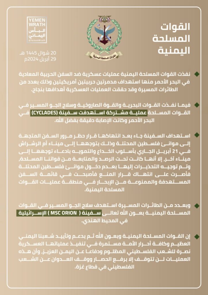 فيما نفذتِ القواتُ البحرية والقوة الصاروخيةُ وسلاحُ الجوِّ المسيرُ في القواتِ المسلحةِ عمليةً مشتركةً استهدفتْ سفينةَ (CYCLADES) في البحرِ الأحمرِ وكانتِ الإصابةُ دقيقةً بفضلِ الله.