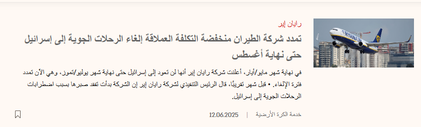 في نهاية شهر مايو/أيار، أعلنت شركة رايان إير أنها لن تعود إلى إسرائيل حتى نهاية شهر يوليو/تموز، وهي الآن تمدد فترة الإلغاء. • قبل شهر تقريبًا، قال الرئيس التنفيذي لشركة رايان إير إن الشركة بدأت تفقد صبرها بسبب اضطرابات الرحلات الجوية إلى إسرائيل.