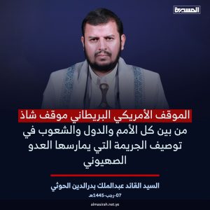 السيد القائد عبدالملك بدرالدين الحوثي: الموقف الأمريكي البريطاني موقف شاذ من بين كل الأمم والدول والشعوب في توصيف الجريمة التي يمارسها العدو الصهيوني