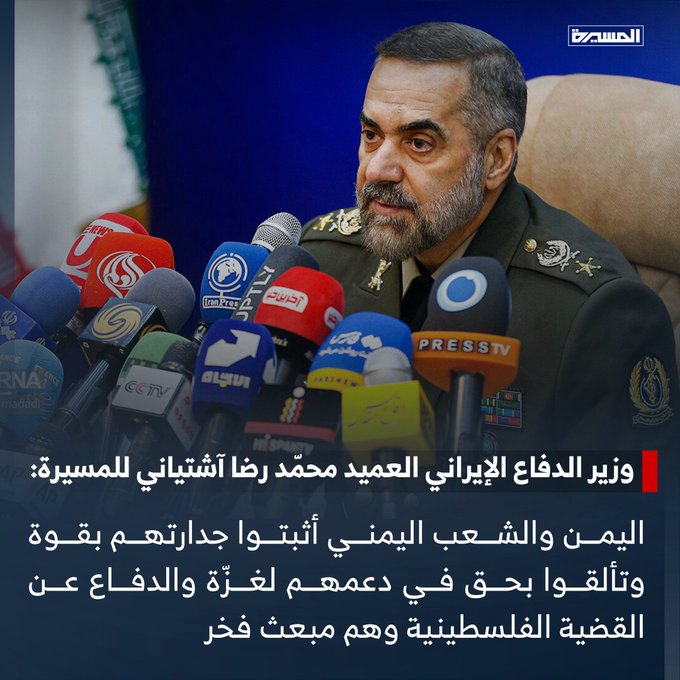 أشاد وزير الدفاع الإيراني، محمد رضا أشتياني، الأحد بصمود الشعب اليمني ودعمه للقضية الفلسطينية،