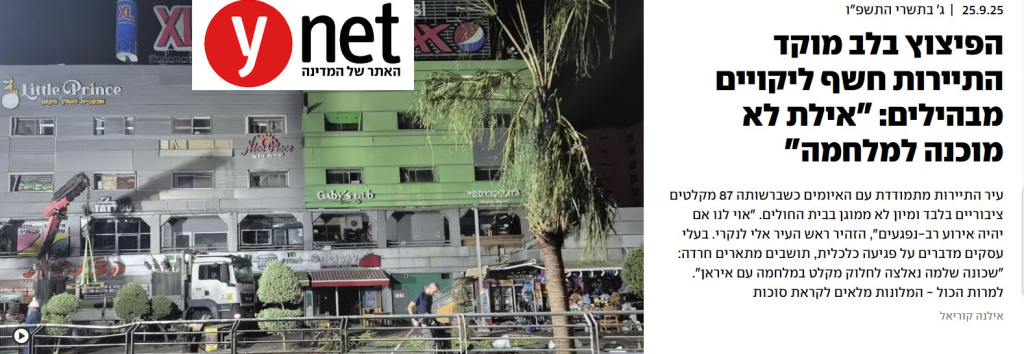 وأورد التقرير أنه يوجد في مدينة إيلات نفسها، 87 ملجأ عاما فقط، نصفها متاح للاستخدام والبقية مجهزة بنظام فتح عن بُعد، ويعيش فيها حوالي أكثر من 70 ألف نسمة، يضاف إلى ذلك عشرات الآلاف من الزوار يوميا وحوالي 3 ملايين سائح سنويًا، مما يولد حوالي 7.5 مليون ليلة إقامة في الفنادق – وهو رقم لا يشمل الإقامات في النُزل وشقق الإيجار.