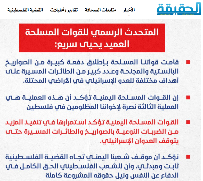 إن القواتِ المسلحةَ اليمنيةَ تؤكدُ أن هذه العمليةَ هي العمليةُ الثالثةُ نصرةً لإخوانِنا المظلومينَ في فلسطينَ، وتؤكدُ استمرارَها في تنفيذِ المزيدَ من الضرباتِ النوعيةِ بالصواريخِ والطائراتِ المسيرةِ حتى يتوقفَ العدوانُ الإسرائيلي.