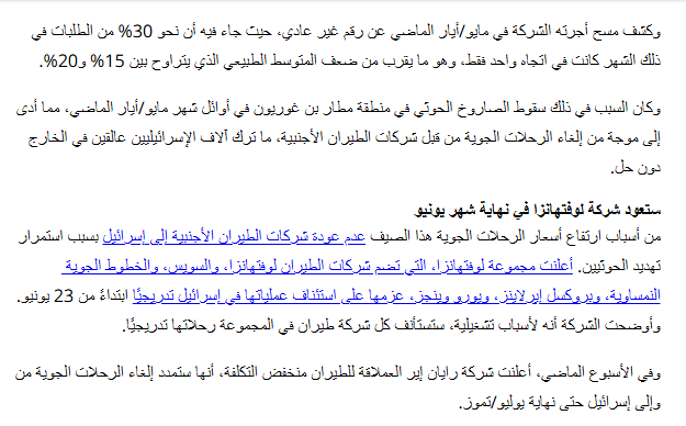 كشفت صحيفة كالكاليست الاقتصادية العبرية عن ارتفاع كبير في أسعار تذاكر الطيران من فلسطين المحتلة خلال موسم الصيف الحالي، نتيجة استمرار العمليات اليمنية المساندة لغزة.